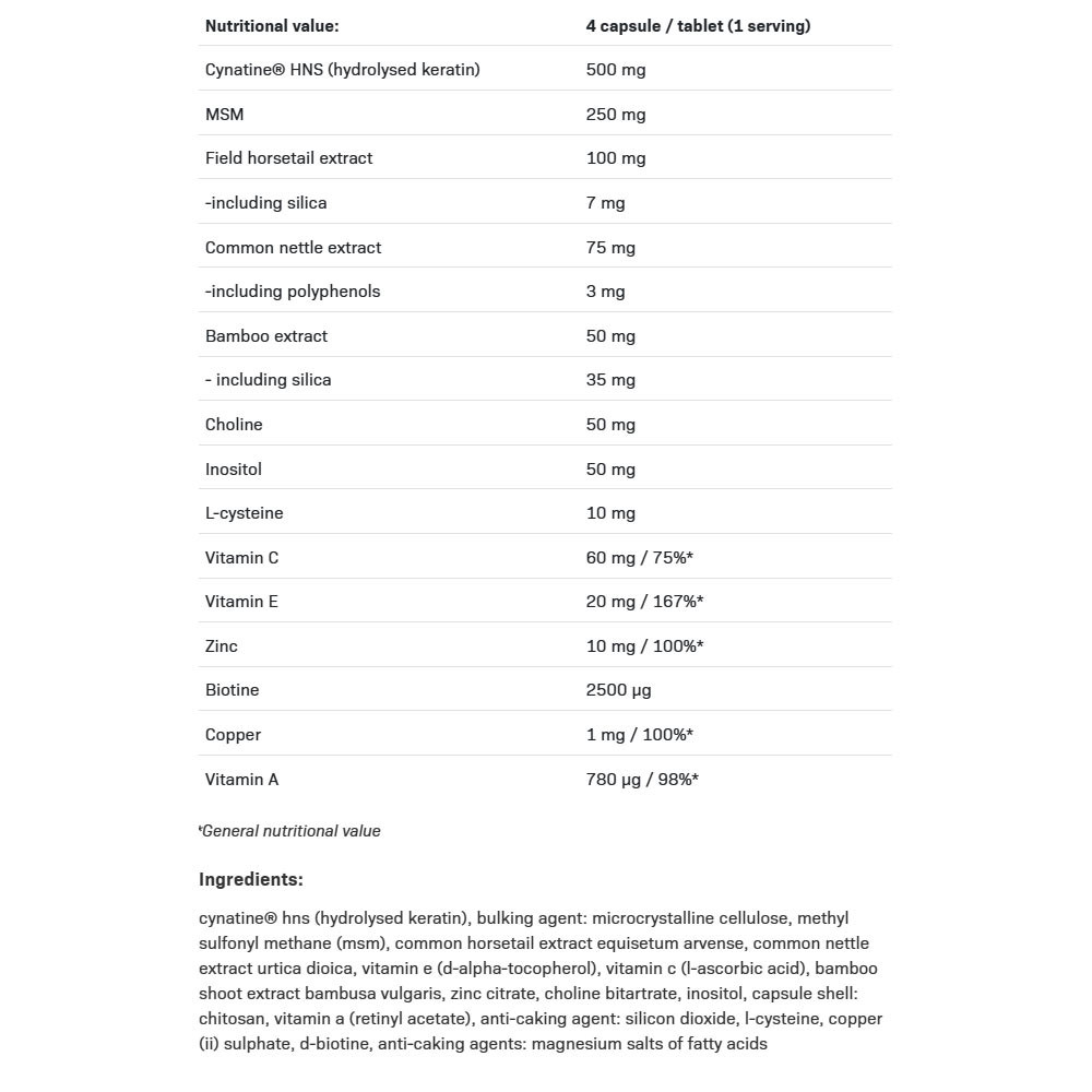 Acesta nu este un supliment alimentar tradițional, ci un produs cosmetic profesional și nutritiv care acționează din interior pentru a ajuta la menținerea stării optime a pielii, părului și unghiilor tale. Printre altele, conține o keratină patentată, cu biodisponibilitate ridicată, produsă de un producător americano-francez, înregistrată sub denumirea de Cynatine NHS.