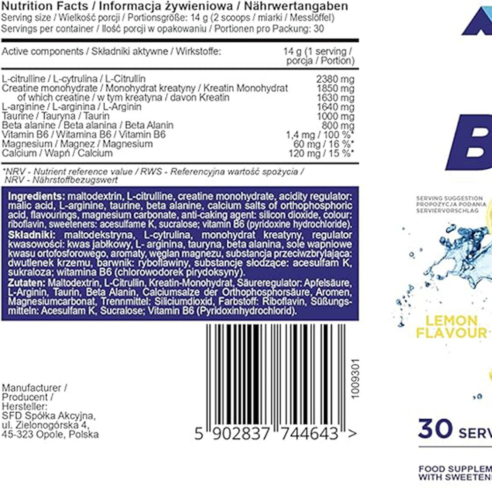 Supliment alimentar. Conține îndulcitor. Conceput pentru persoanele active fizic cu vârsta peste 18 ani. Nu utilizați dacă sunteți alergic la oricare dintre ingrediente. Nu depășiți doza zilnică recomandată. Suplimentele alimentare nu trebuie utilizate ca substitut pentru o dietă variată. Se recomandă o dietă echilibrată și un stil de viață sănătos. Beta-alanina poate provoca o senzație ușoară de furnicături la persoanele sensibile. Poate conține derivate din cereale care conțin gluten, soia și lapte. Produsul poate forma aglomerări, însă acest lucru nu îi afectează proprietățile. Închideți întotdeauna ambalajul bine după utilizare.