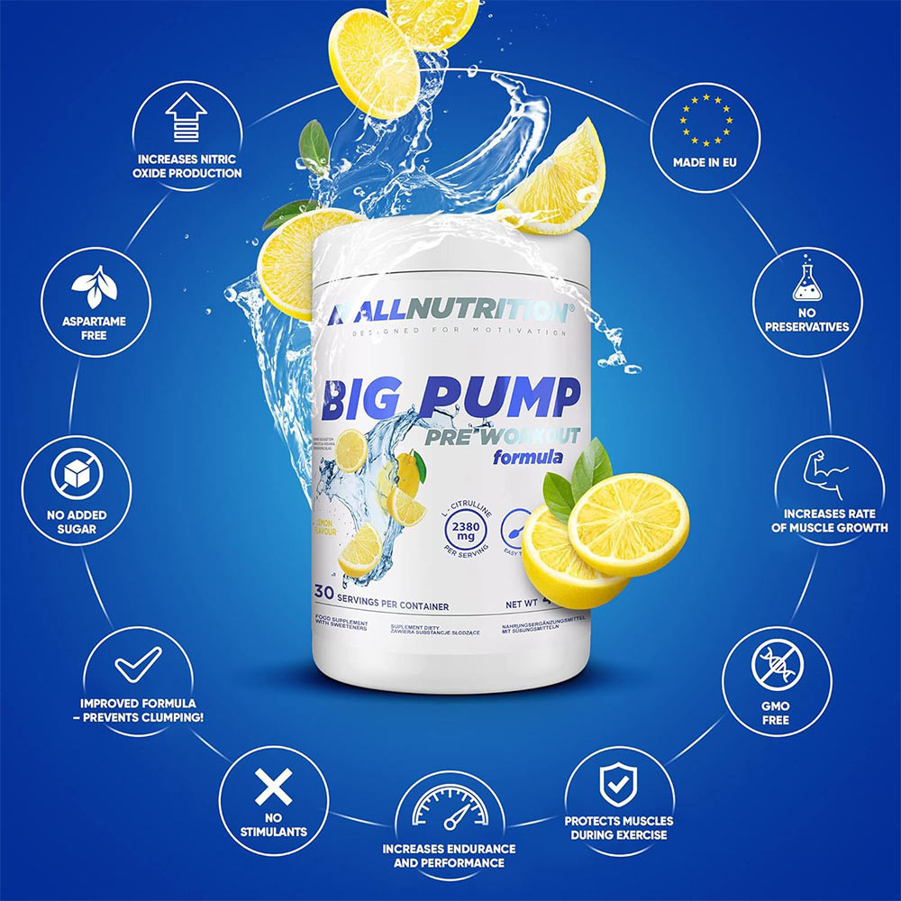 ALLNUTRITION BIG PUMP PRE WORKOUT este o formulă pre-workout concepută pentru sportivii de forță care doresc să experimenteze efectul de "pump" în timpul antrenamentului, fără nevoie de stimulare suplimentară. Formula este disponibilă în diferite arome și se dizolvă ușor în apă, făcând prepararea băuturii pre-workout rapidă și convenabilă.