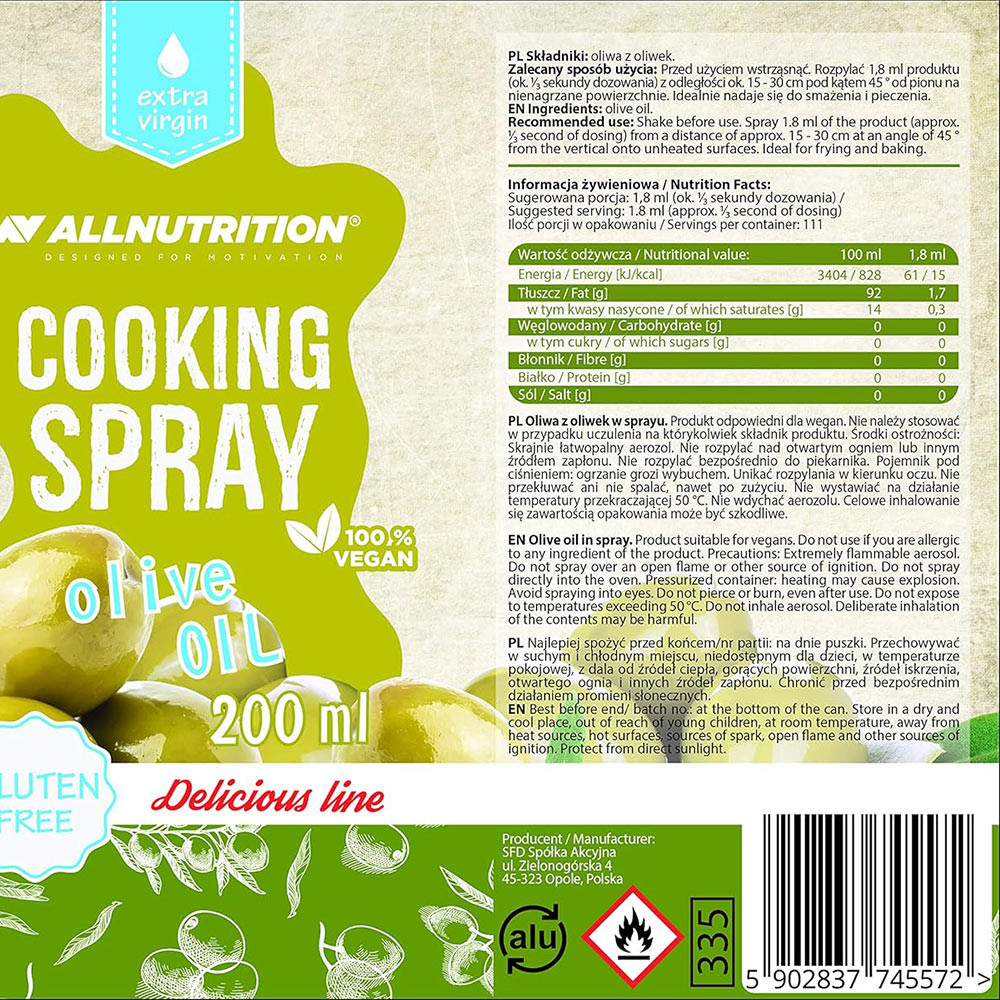 ALLNUTRITION COOKING SPRAY OLIVE OIL este conceput pentru cei care apreciază un stil de viață sănătos și mesele delicioase gătite acasă. Singurul său ingredient este uleiul de măsline, binecunoscut pentru gustul său distinctiv și proprietățile sale benefice pentru sănătate. Este bogat în acizi grași esențiali nesaturați și conține compuși valoroși precum polifenoli, dar și vitaminele E și K.