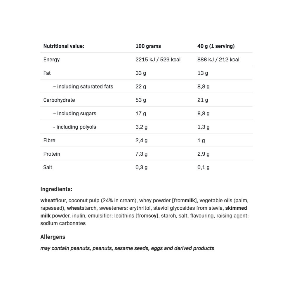 Napolitane umplute cu cremă de arahide (73%). Conține îndulcitori. Fără zahăr adăugat. Conține zaharuri care apar în mod natural. Nu consumați dacă sunteți alergic sau sensibil la oricare dintre ingrediente.