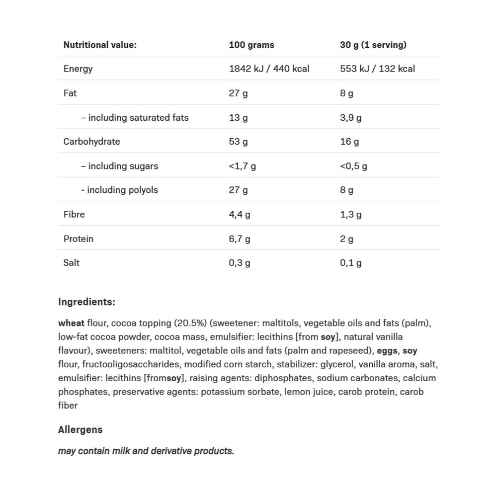 Napolitană cu aromă de vanilie, cu glazură de cacao fără zahăr. Conține îndulcitor. Consumul excesiv poate avea efect laxativ. Nu consumați dacă sunteți alergic (hipersensibil) la oricare dintre ingrediente. Pot fi prezente lapte și produse derivate din lapte.