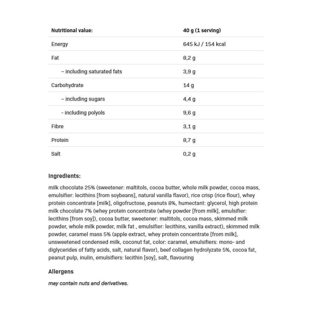 ALLNUTRITION FITKING PROTEIN SNACK BAR este un baton delicios, bogat în proteine, realizat dintr-un amestec atent selectat de ingrediente. Este plin cu o umplutură moale și catifelată, acoperit cu ciocolată cu lapte și nuci crocante – totul fără zahăr adăugat!