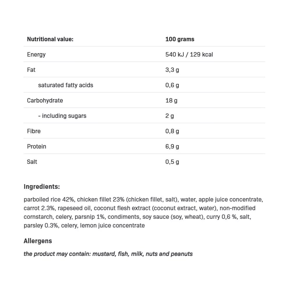 ALLNUTRITION FITMEAL CURRY – pui cu orez în sos curry, un preparat de calitate premium conceput pentru a satisface chiar și cele mai exigente gusturi. Combină cea mai bună carne de pasăre, legume atent selecționate și orez – toate completate de un sos curry bogat. Această masă nutritivă, săracă în grăsimi și zahăr, te ajută să-ți controlezi cu ușurință aportul de calorii.