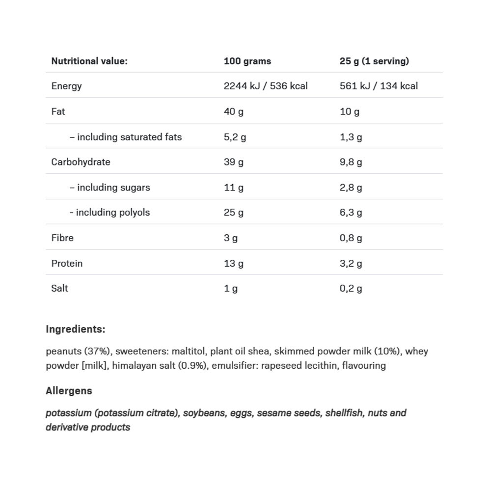 Cremă cu arahide și lapte, cu sare de Himalaya. Conține îndulcitor. Fără zahăr adăugat. Conține zaharuri care apar în mod natural. Nu consumați dacă sunteți alergic la oricare dintre ingrediente. O dietă variată și echilibrată și un stil de viață sănătos sunt importante. Consumul excesiv poate avea efect laxativ. Produsul poate conține fragmente de coajă. Amestecați înainte de utilizare. Produsul poate conține și cereale care conțin gluten, soia, ouă, semințe de susan, crustacee, nuci și derivații acestora.