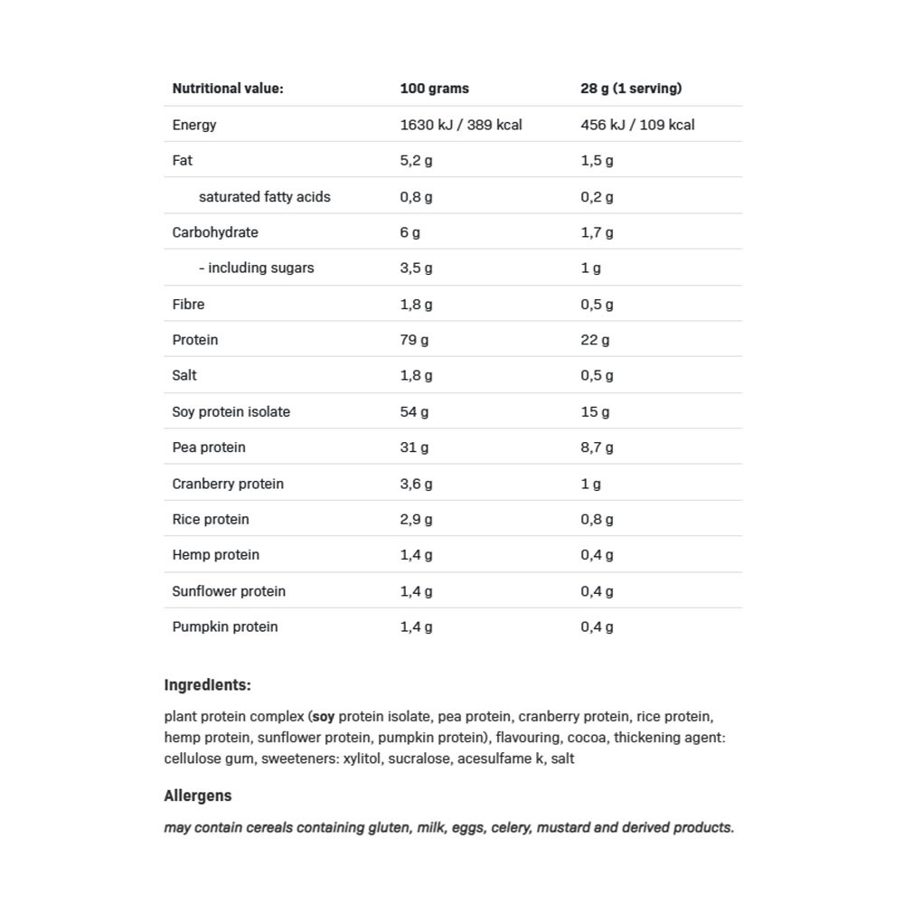 NUTRIȚIE COMPLETĂ PE BAZĂ DE PLANTE VEGAN PROTEIN conține până la 7 tipuri de proteine vegetale: izolat proteic din soia, mazăre, merişor, orez, floarea-soarelui, migdale și cânepă. Baza produsului este izolatul proteic din soia – o sursă valoroasă și completă de proteină.