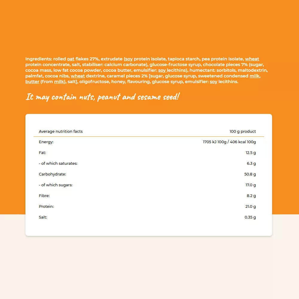 Ingrediente:fulgi de ovăz presați 27%, extrudat (izolat proteic din soia, amidon de tapioca, izolat proteic din mazăre, concentrat proteic din grâu, sare, stabilizator: carbonat de calciu), sirop de glucoză-fructoză, bucăți de ciocolată 7% (zahăr, masă de cacao, pudră de cacao degresată, unt de cacao, emulsifiant: lecitină de soia), agent de umezire: sorbitoli, maltodextrină, grasime de palmier, cacao boabe sfărămate, dextrină din grâu, bucăți de caramel 2% [zahăr, sirop de glucoză, lapte condensat îndulcit, unt (din lapte) sare], oligofructoză, miere, aromă, sirop de glucoză, emulsifiant: lecitină de soia.