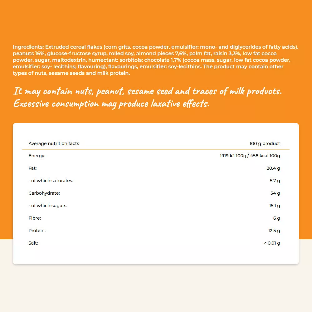Ingrediente:Fulgi de cereale extrudate (boabe de porumb, pudră de cacao, emulgator: mono- și digliceride ale acizilor grași), alune 16%, sirop de glucoză-fructoză, rulouri de soia, bucăți de migdale 7,6%, grăsime de palmier, stafide 3,3%, pudră de cacao cu conținut scăzut de grăsime, zahăr, maltodextrină, umectant: sorbitoli ciocolată 1,7% (masă de cacao, zahăr, pudră de cacao cu conținut scăzut de grăsime, emulgator: lecitină de soia aromă), arome, emulgator: lecitină de soia. Produsul poate conține și alte tipuri de nuci, semințe de susan și proteine din lapte.