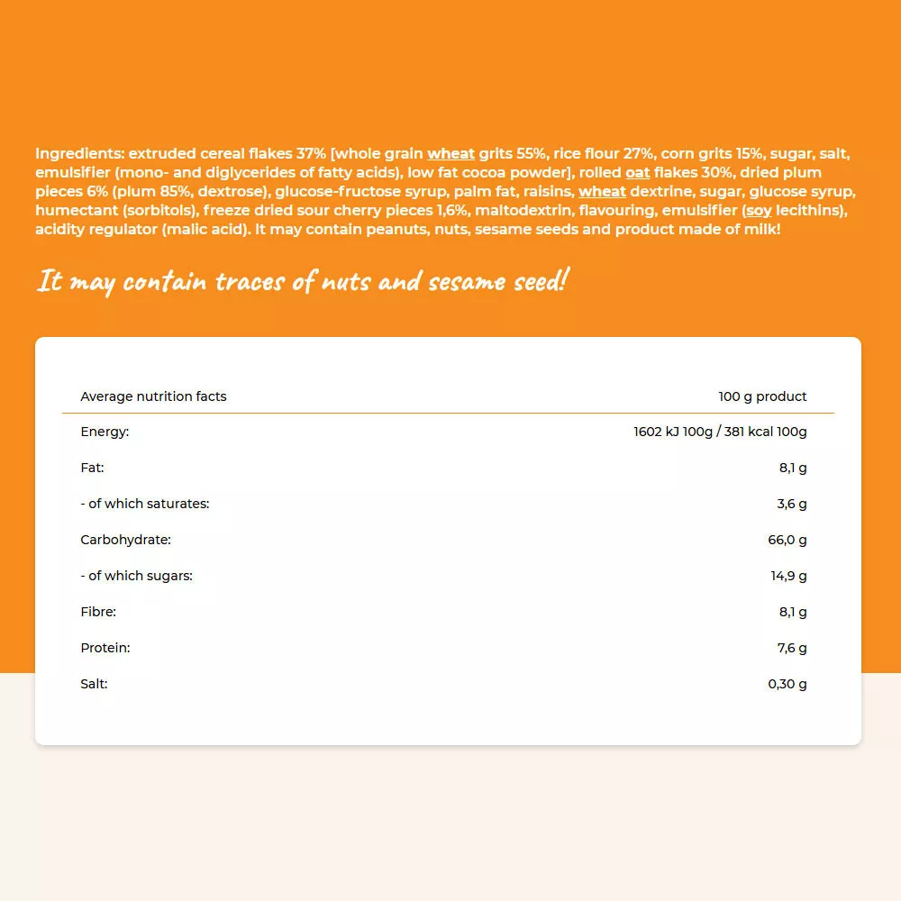 Ingrediente:fulgi de cereale extrudate 37% [crupe de grâu integral 55%, făină de orez 27%, griș de porumb 15%, zahăr, sare, emulsifiant (mono- și digliceride ale acizilor grași), pudră de cacao cu conținut redus de grăsime], fulgi de ovăz presați 30%, bucăți de prune uscate 6% (prune 85%, dextroză), sirop de glucoză-fructoză, grasime de palmier, stafide, dextrină din grâu, zahăr, sirop de glucoză, agent de umezire (sorbitoli), vișine liofilizate 1,6%, maltodextrină, aromă, emulsifiant (lecitină de soia), corector de aciditate (acid malic). Produsul poate conține urme de fructe cu coajă lemnoasă, arahide, semințe de susan și produse din lapte.