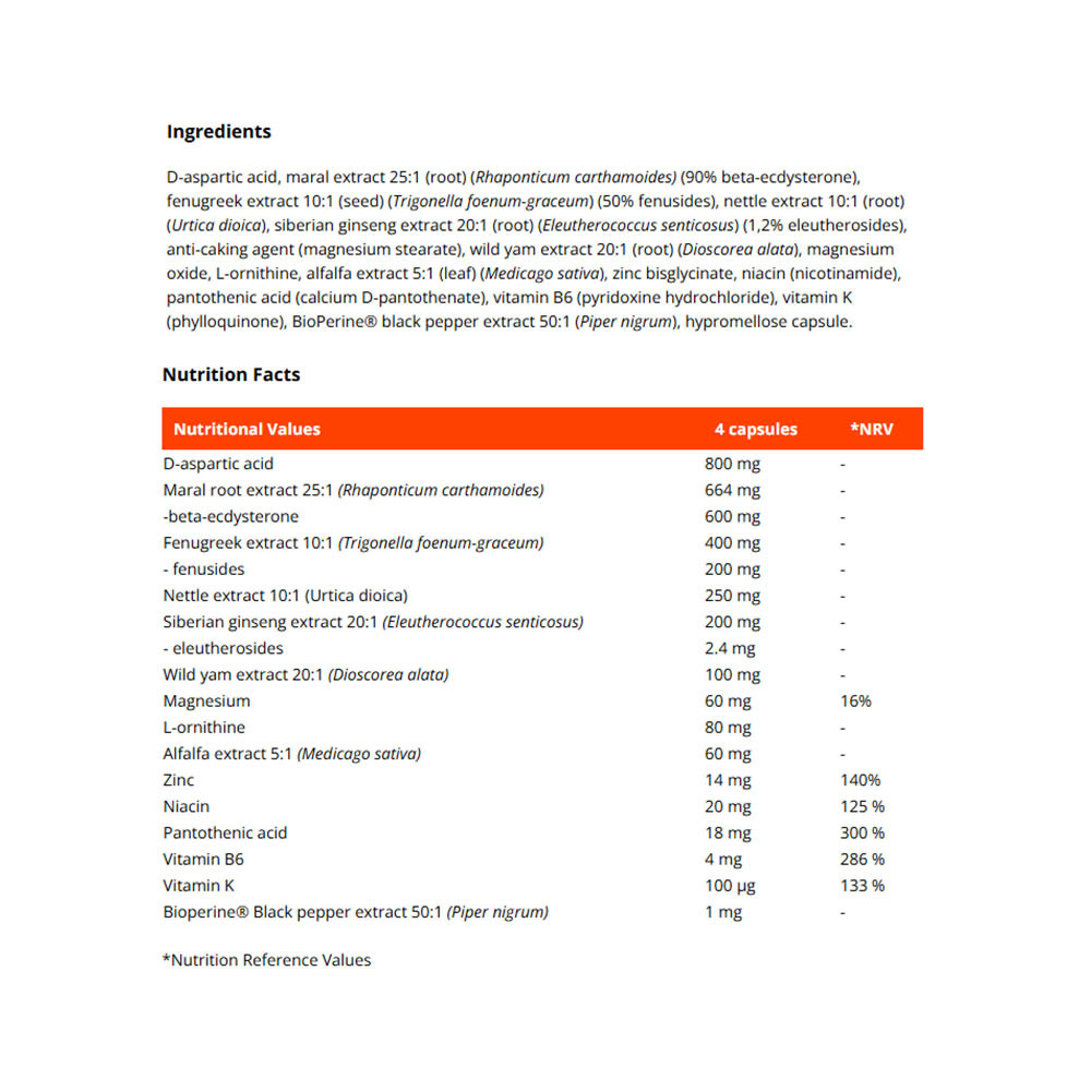 De menționat și acidul pantotenic (vitamina B5), care, printre altele, contribuie la o performanță mentală sănătoasă. Mai mult, participă la sinteza și transformarea corectă a hormonilor steroizi, a vitaminei D și a unor neurotransmițători. AlphaMale TestoBooster conține, de asemenea, extracte din plante precum rădăcină de leuzea (Rhaponticum carthamoides), schinduf (Trigonella foenum-graceum), urzică (Urtica dioica), ginseng siberian (Eleutherococcus senticosus), ignam sălbatic (Dioscorea alata) și lucernă (Medicago sativa). Astfel, este un supliment cuprinzător, apreciat de sportivii de anduranță și de forță, de iubitorii unui stil de viață activ și de toți bărbații care vor doar ce este mai bun.