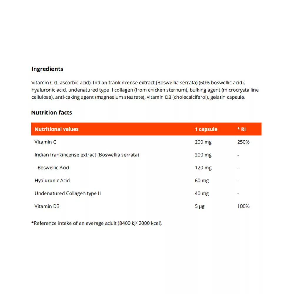 Alte ingrediente cheie includ acidul hialuronic, care se găsește în mod natural în articulații. De asemenea, conține vitamina D, ce are efect asupra funcționării corecte a mușchilor și sănătății oaselor. În plus, contribuie la menținerea unui nivel normal de calciu în sânge și la absorbția și utilizarea adecvată nu doar a calciului, ci și a fosforului. Lista de ingrediente a complexului este completată de extractul la fel de important din tămâia indiană (Boswellia serrata) cu 60% acid boswelic. Collagen Type II Joint Complex este ideal pentru toți bărbații și femeile datorită formulei sale. În plus, are o formă practică, ușor de administrat.