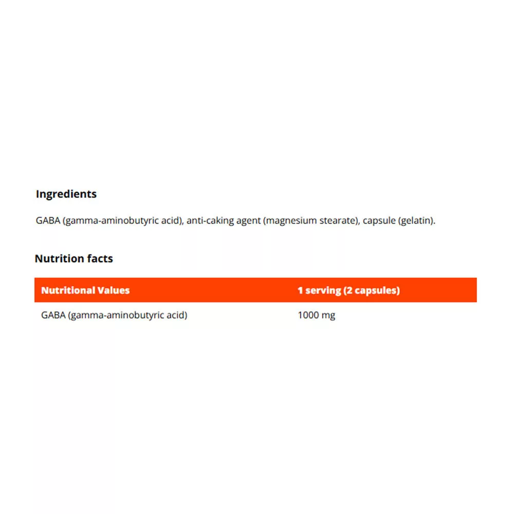 GABA este un acid gamma-aminobutiric care se găsește în mod obișnuit în creierul nostru. Este unul dintre principalii neurotransmițători inhibitori. Acestea sunt substanțele care, în general, servesc la transmiterea semnalelor între celulele nervoase. Este utilizat sub formă de supliment alimentar ca parte a unui stil de viață echilibrat. În acest produs, vei găsi GABA sub formă de capsule convenabile, care sunt ușor de administrat.