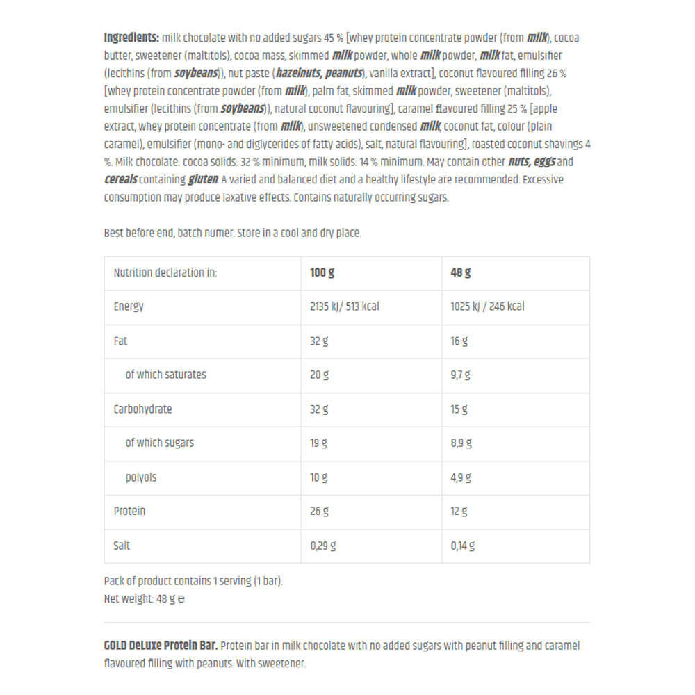 Ingrediente: ciocolată cu lapte fără zahăr adăugat 45% [pudră concentrat proteic din zer (din lapte), unt de cacao, îndulcitor (maltitoli), masă de cacao, lapte praf degresat, lapte praf integral, grăsime din lapte, emulgator (lecitină (din soia)), pastă de nuci (alune de pădure, arahide), extract de vanilie], umplutură cu aromă de cocos 26% [pudră concentrat proteic din zer (din lapte), grăsime de palmier, lapte praf degresat, îndulcitor (maltitoli), emulgator (lecitină (din soia)), aromă naturală de cocos], umplutură cu aromă de caramel 25% [extract de măr, concentrat proteic din zer (din lapte), lapte condensat fără zahăr, grăsime de cocos, colorant (caramel simplu), emulgator (mono- și digliceride ale acizilor grași), sare, aromă naturală], fulgi de cocos prăjiți 4%. Ciocolată cu lapte: solide din cacao: minimum 32%, solide din lapte: minimum 14%. Poate conține alte fructe cu coajă, ouă și cereale care conțin gluten. Se recomandă o dietă variată și echilibrată și un stil de viață sănătos. Consumul excesiv poate avea efect laxativ. Conține zaharuri ce apar în mod natural.UTILIZARE (1 doză = 48 g)