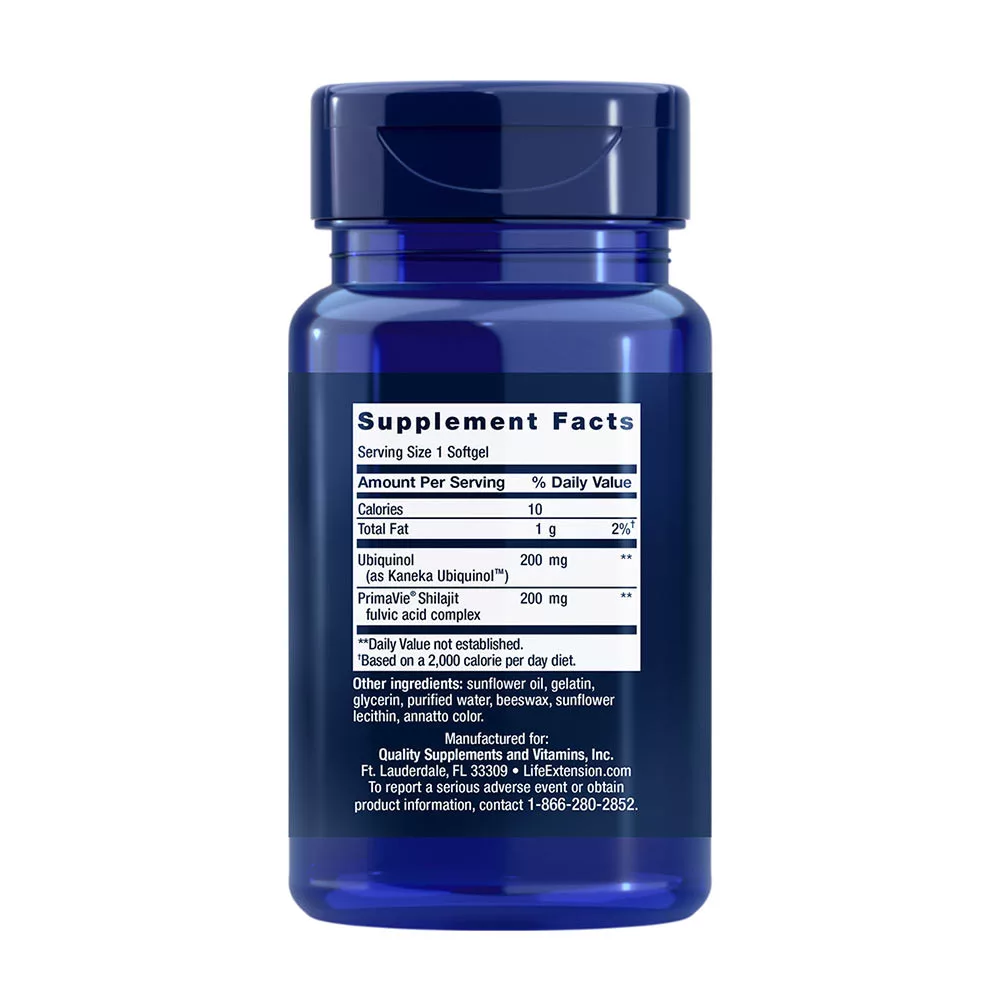 Super Ubiquinol CoQ10 cu Enhanced Mitochondrial Support™ combină ubiquinol CoQ10 super absorbabil cu shilajit pentru a stimula producția de energie mai mult decât CoQ10 singur.