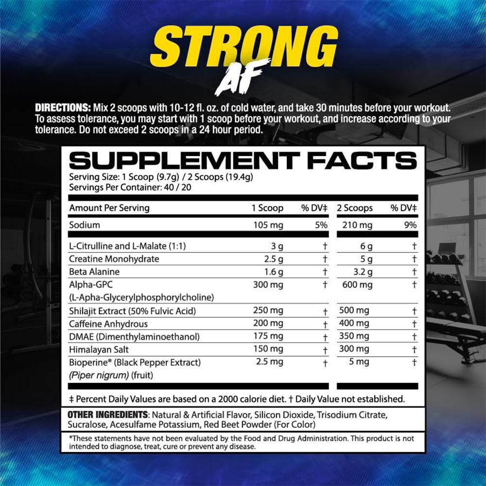 PRE-WORKOUT PUTERNIC: Formulat cu ingrediente cercetate clinic în doze eficiente, STRONG AF folosește sinergia multi-canal pentru a optimiza forța musculară, intensitatea antrenamentului, concentrarea cognitivă, energia, fluxul sanguin îmbunătățit, pomparea musculară și testosteronul pentru performanță maximă în timpul antrenamentelor, dezvoltarea și recuperarea masei musculare.