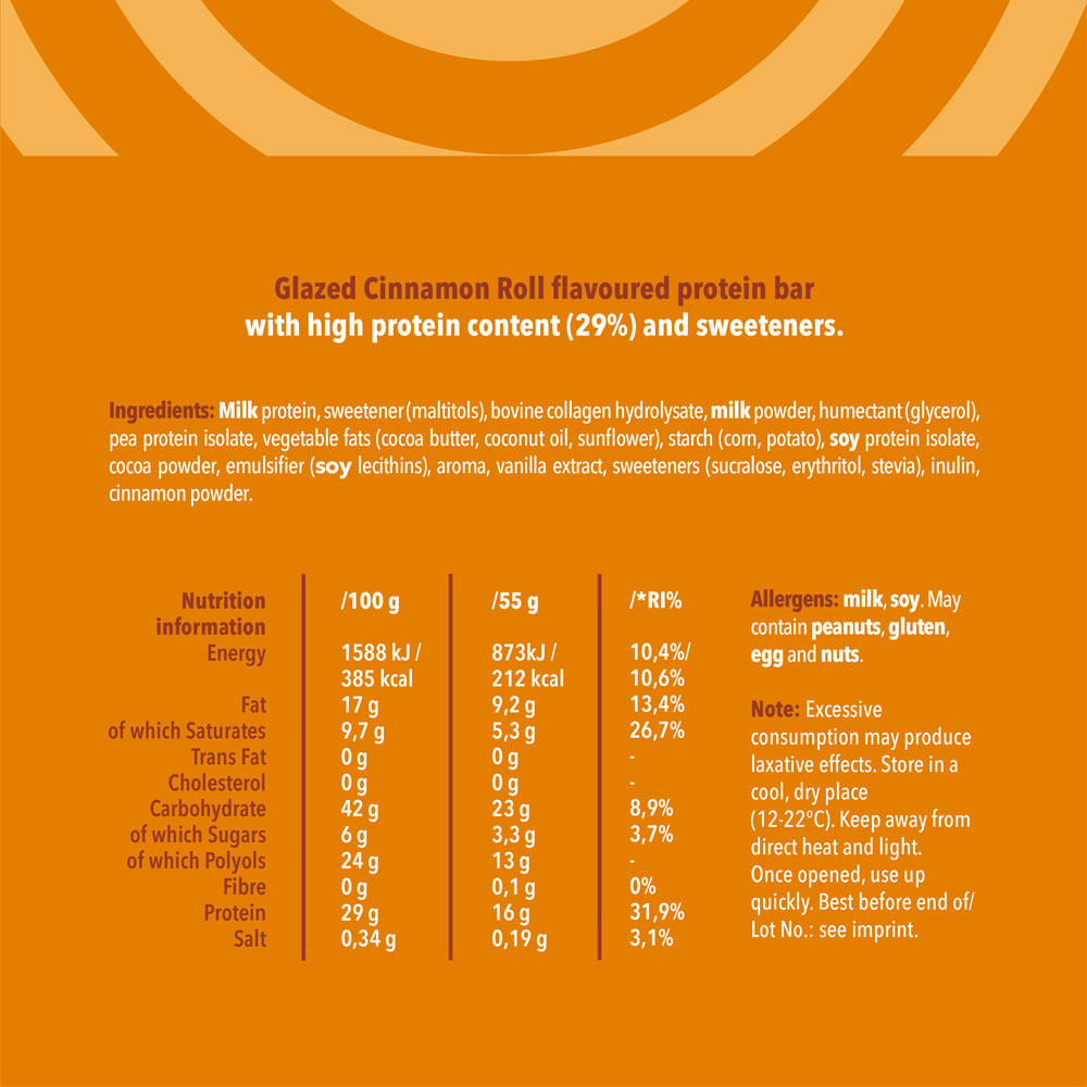 Dulce, picant și atât de satisfăcător! Cu 16g de proteine, această Baton Proteic Glazed Cinnamon Roll este răsfățul tău zilnic fără să te simți vinovat.