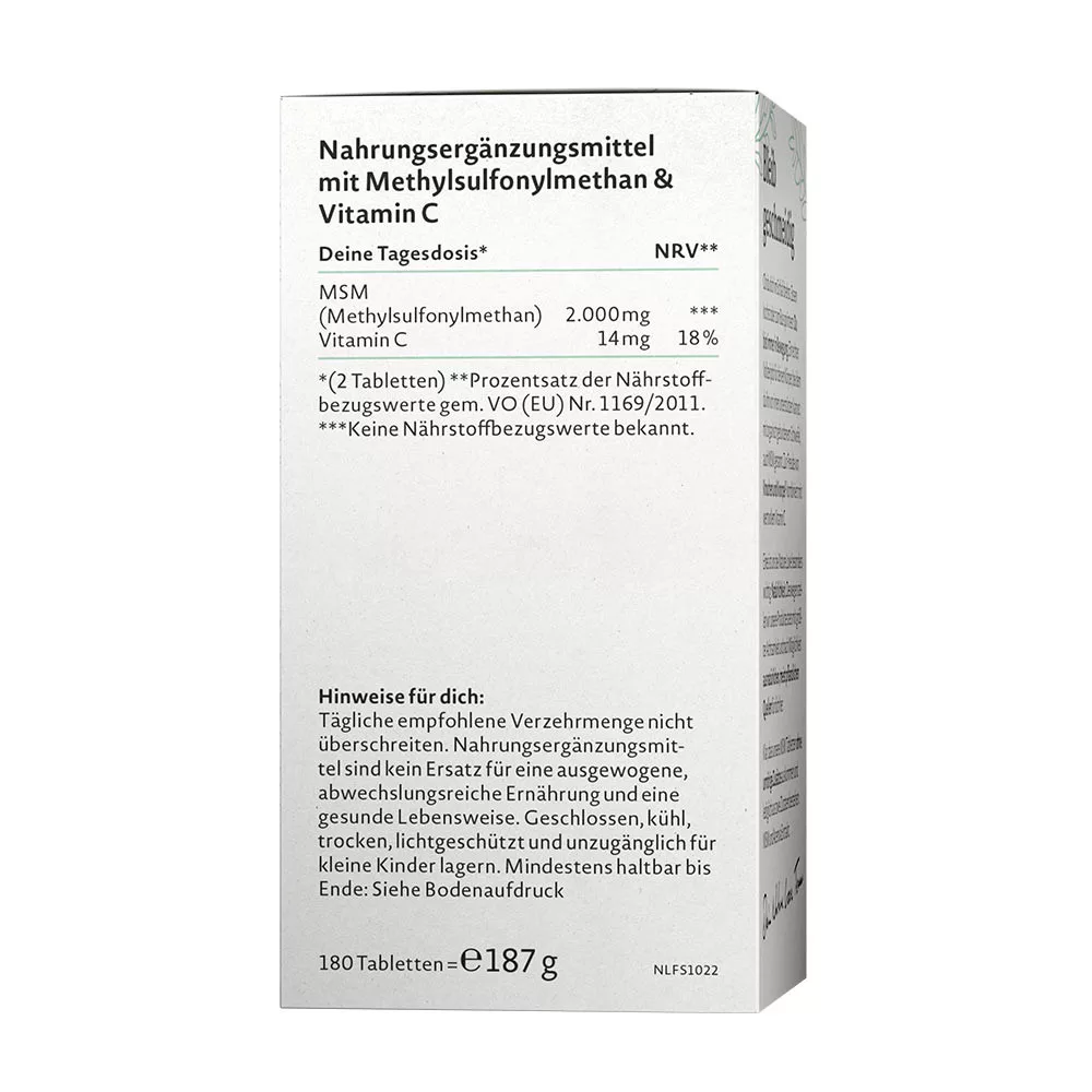 Fie că te foiesti în somn, gătești mâncăruri sau alergi după autobuz – ești mereu în mișcare. Un adevărat job cu normă întreagă pentru corpul tău, pe care îl poți susține din interior: cu sulf legat organic, cunoscut și sub numele de MSM. Spre bucuria oaselor și a cartilajelor, acesta este combinat cu valorosul vitamina C. Tabletele noastre cu MSM vin fără aditivi inutili și conțin doar două ingrediente: MSM și vitamina C.