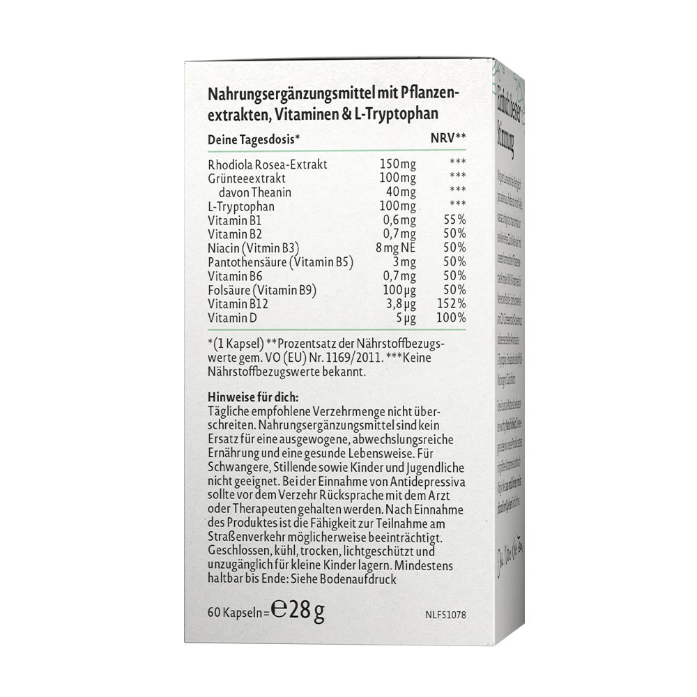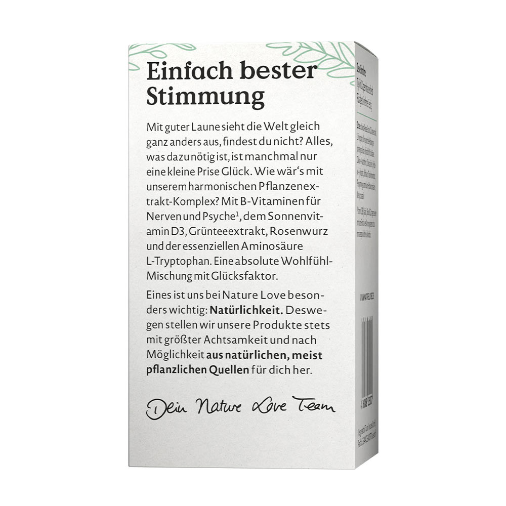 Fără OMGCu o stare de spirit bună, lumea arată complet diferit, nu crezi? Uneori, tot ce ai nevoie este doar o mică doză de fericire. Acum o vei găsi în complexul nostru armonios de origine vegetală: cu 7 vitamine B esențiale pentru susținerea nervilor și a psihicului, vitamina D3 – vitamina soarelui, teanină din extract de ceai verde, rhodiola de înaltă calitate și aminoacidul esențial L-triptofan. Împreună, un amestec absolut de bine, cu factor de fericire – și, desigur, complet relaxat, fără aditivi inutili.