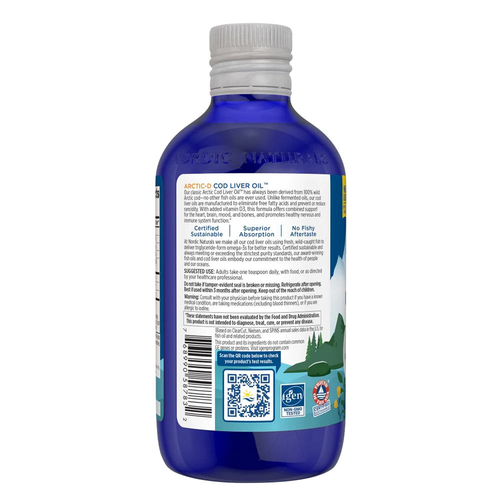 Obținută în mod sustenabil în Norvegia, Arctic-D Cod Liver Oil™ include formula noastră premiată de ulei de ficat de cod cu 25 mcg (1000 UI) de vitamina D3 naturală adăugată.