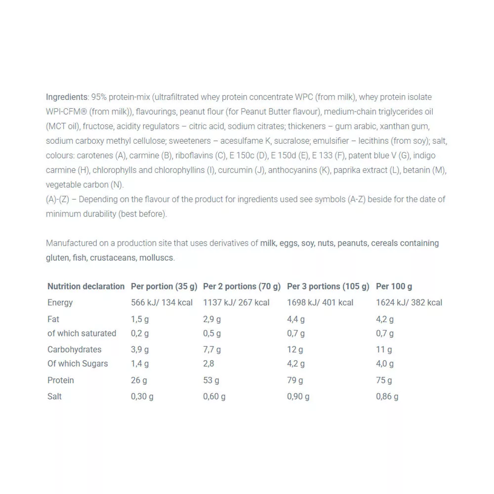 WHEY PROTEIN COMPLEX 100% – supliment alimentar. Cu zahăr și îndulcitori. Produs aromatizat. Concentrat bogat în proteine sub formă de pudră. Amestec de concentrat de proteine din zer ultrafiltrat de înaltă calitate și izolat de proteine din zer. Produsul este destinat persoanelor active fizic și sportivilor care urmăresc dezvoltarea masei musculare. Proteina contribuie la creșterea și menținerea masei musculare.