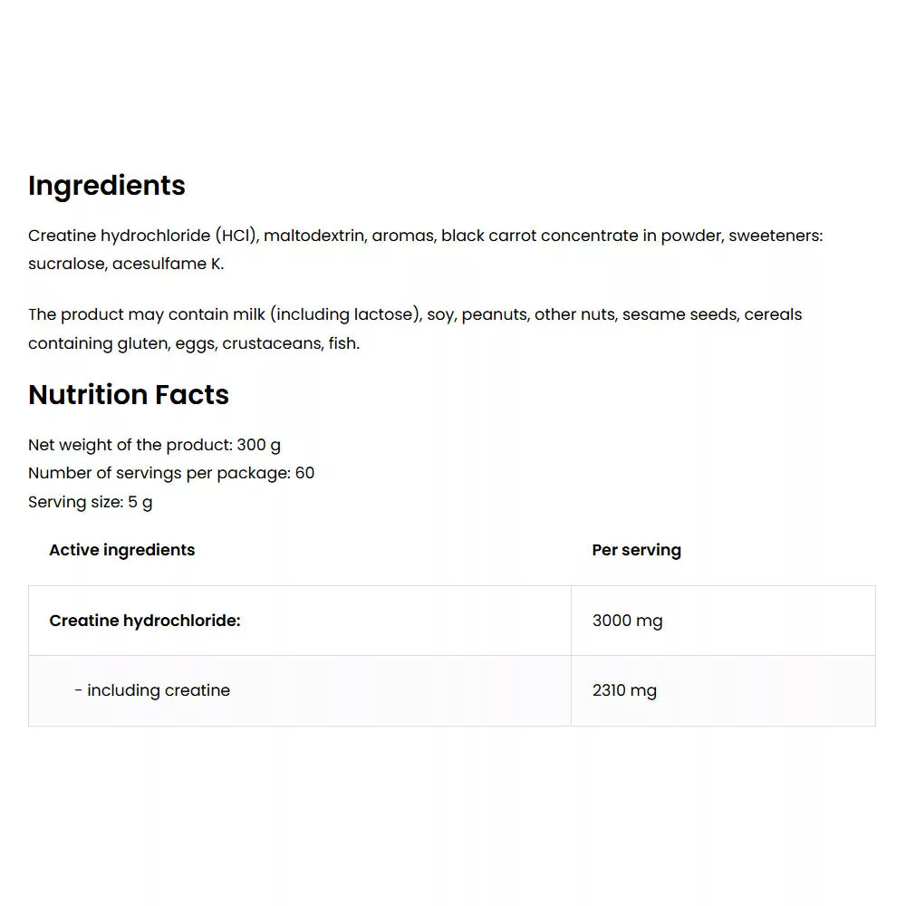 Când alegeți forma de clorhidrat de creatină, acordați o atenție fără precedent solubilității produsului, care este de cel puțin câteva zeci de ori mai bună decât creatina monohidrat obișnuită. Clorhidratul de creatină va fi cu siguranță mai bun pentru persoanele care pot avea probleme gastrice și digestive din cauza suplimentării cu monohidrat de creatină.