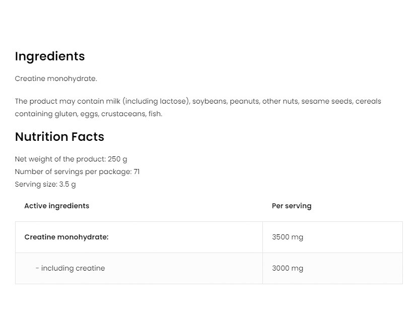 - Sursa de creatină - O porție de supliment alimentar asigură organismului 3500 mg de creatină monohidrat