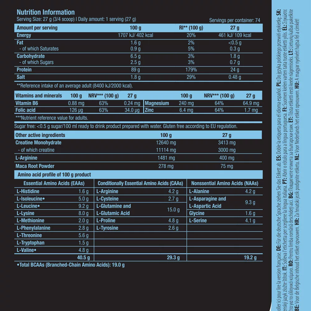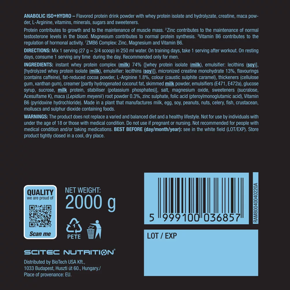 Proteinele sunt elementele constitutive ale mușchilor. Proteinele contribuie la creșterea și menținerea masei musculare. Acest lucru a fost spus de multe ori și în multe locuri. Dar Anabolic Iso+Hydro este mai mult decât o simplă proteină. Acesta conține extracte precum HMB, extract de maca sau chiar extract de ZMB6 cu zinc, magneziu și vitamina B6. Zincul ajută la menținerea unui nivel normal de testosteron în sânge. Magneziul joacă un rol în sinteza normală a proteinelor, iar vitamina B6 ajută la reglarea activității hormonale. Ca să nu mai vorbim de cele 3,4 g de creatină monohidrat pe porție, care, în asemenea cantități, îmbunătățește performanța fizică în timpul unor explozii scurte de exerciții fizice de intensitate ridicată.