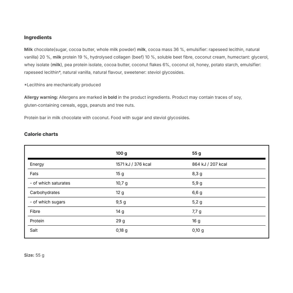 Pentru răsfățul maxim al papilelor gustative, am combinat nuca de cocos rasă cu unt cremos de cocos și o porție generoasă de proteină completă. Ca bonus, întregul baton este acoperit cu ciocolată cu lapte premium.