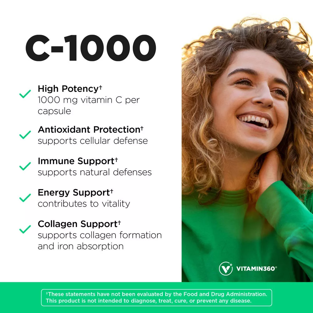 Vitamina C este una dintre cele mai cunoscute vitamine, însă mulți oameni îi realizează importanța abia atunci când organismul lor are cea mai mare nevoie de ea. Vitamin360 C-1000 oferă acest nutrient esențial într-o formă cu doză mare și absorbție excelentă, exact când corpul are nevoie cel mai mult.