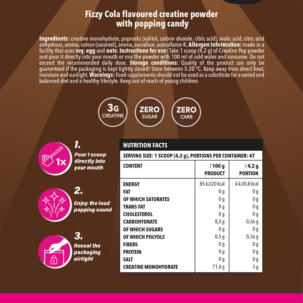 Fiecare porție oferă creatină monohidrat pură îmbogățită cu adevărate bombonele pocnitoare, transformând doza ta zilnică într-o experiență explozivă.